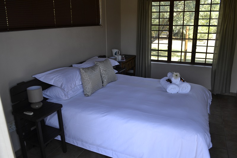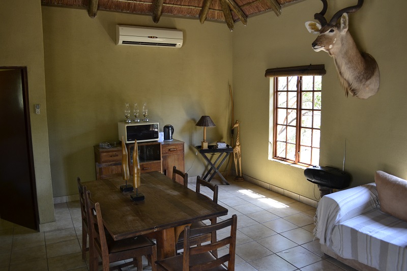 The chalets are furnished with a queen size bed and single bed all covered with white linen, built-in cupboard, en-suite bathroom containing a shower, toilet and basin. All chalets are fitted with an air conditioning unit for heating and cooling. Two of the chalets are right up against the fence and third chalet also has a good view of the bush. The three chalets and cottage share a communal kitchen near the main boma area and have their own braai at the chalet. The chalets are suited for two adults and a child or third adult.