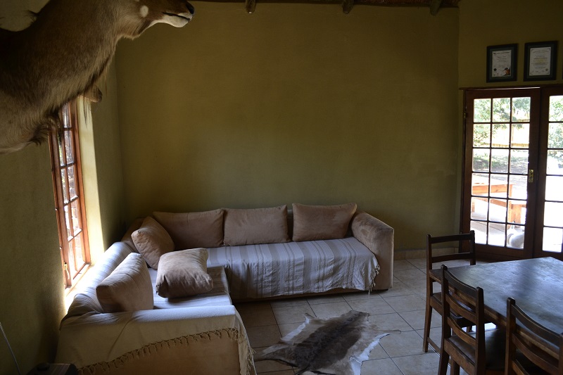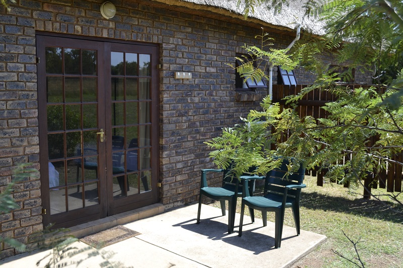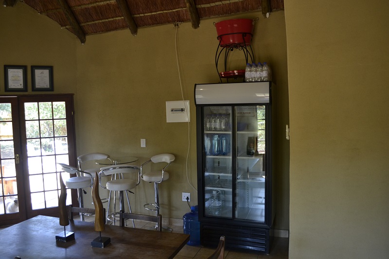 The chalets are furnished with a queen size bed and single bed all covered with white linen, built-in cupboard, en-suite bathroom containing a shower, toilet and basin. All chalets are fitted with an air conditioning unit for heating and cooling. Two of the chalets are right up against the fence and third chalet also has a good view of the bush. The three chalets and cottage share a communal kitchen near the main boma area and have their own braai at the chalet. The chalets are suited for two adults and a child or third adult.